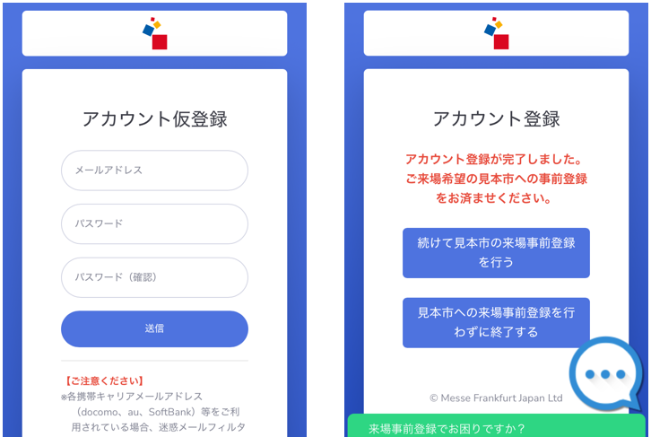「アカウント登録」→「来場事前登録」をお願いします。